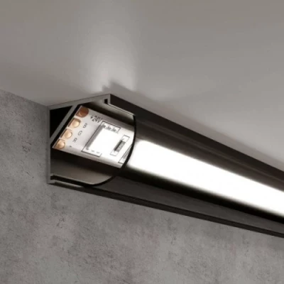A trapezoidal or triangular section makes the corner profile optimal for installation at the junction of a wall with a ceiling - instead of a plinth, embedding in corners, niches, furniture, space under the stairs. It is mounted in the same way as the consignment note. As a rule, corner profiles are installed at an angle of 45º. A similar corner fastener is used to organize lighting in a cabinet or in showcases in situations where it is not possible to use overhead, mortise or built-in modifications.