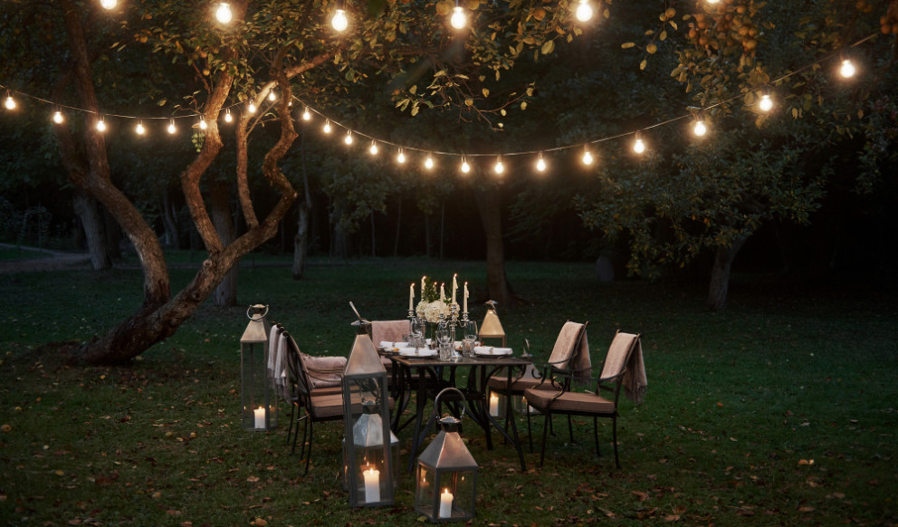 Šeit dizains bieži vien ir svarīgāks, taču nevajadzētu aizmirst arī par aizsardzību. Pat virtenēm, laternām un celiņu apgaismojumam ir nepieciešams vismaz IP44.