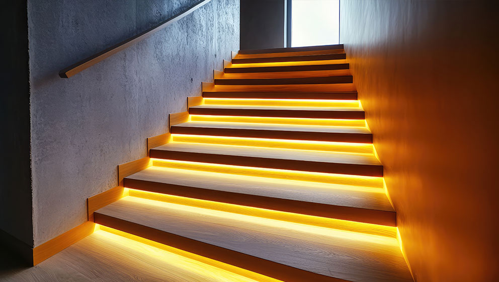 Kad pakāpieni ir izgaismoti, ir redzama katra detaļa. Acs ātri pielāgojas gaismai, un līdz ar to – samazinās kritienu risks. Īpaši, ja lente ir maigi iestrādāta sānos vai zem pakāpiena, tā nežilbina acīs, netraucē, bet apgaismo tieši tā, kā vajag.