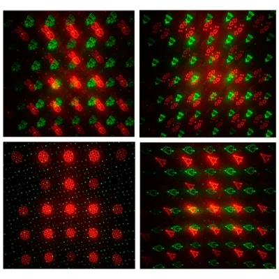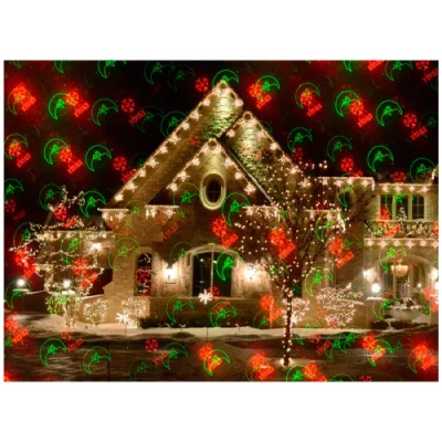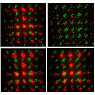 • Projekcijas zīmējumi Sarkana + zaļa zvaigzne / lāzera ugunspuķe, sinhronizācija, stroboskopiskais efekts, ar 12 rakstiem Ziemassvētki, zvans, zieds, egle, tauriņš, mēness, "es mīlu tevi" zīme, sniegpārsla, Ziemassvētku vecītis utt.