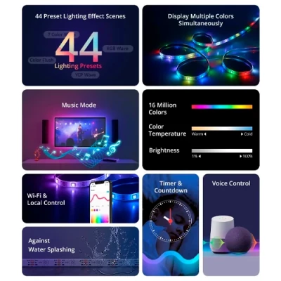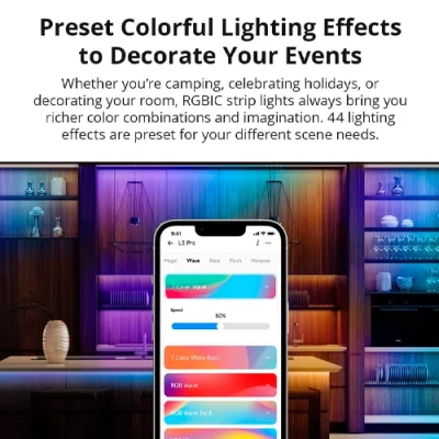 • 44 iepriekš iestatīti apgaismojuma efektu sižeti: 44 apgaismojuma efekti ir iepriekš iestatīti dažādām sižetu vajadzībām. RGBIC sloksnes gaismas vienmēr sniedz jums bagātīgākas krāsu kombinācijas un iztēli.