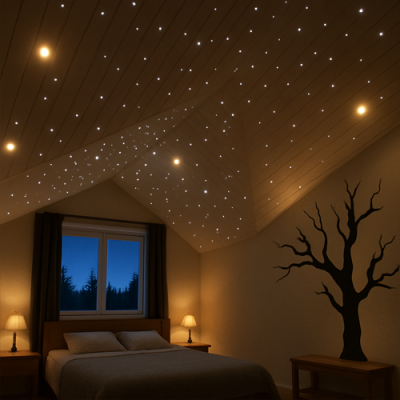LED apgaismojums "zvaigžņotās debesis" ir mūsdienīgs risinājums īpašas atmosfēras radīšanai interjerā. Griesti pārvēršas par nakts debesu imitāciju ar mirdzošiem gaismas punktiem, kas piešķir telpai mājīgumu un stilu. Šāda sistēma ir piemērota uzstādīšanai guļamistabā, viesistabā, bērnu istabā, mājas kinoteātrī, SPA zonā, restorānā vai atpūtas telpā.