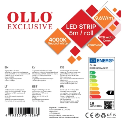 LED lente SMD2835, 4000K, IP65, 12V, 9.6W/m, 1020Lm/m OLLO / 05-1728 / LED Lente / 4000K - neitrāli balta / IP65 / 9.6 W/m / 1020 lm/m / 120 LED/m / SMD2835