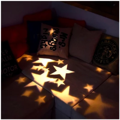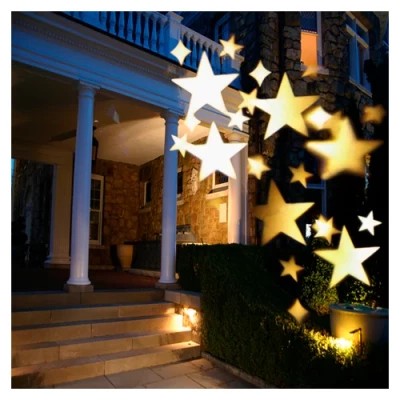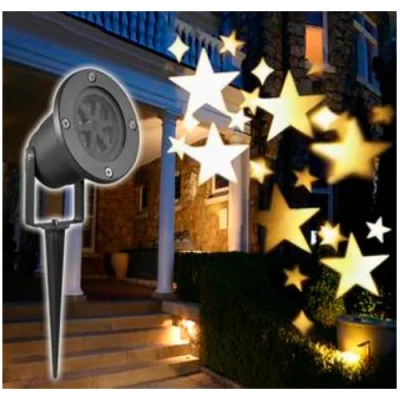 Dārza projektors ar silti balto zvaigžņu projekciju. Projektoru var pieskrūvēt pie fasādes, nolikt uz kādas virsmas vai iebūvēt zemē.