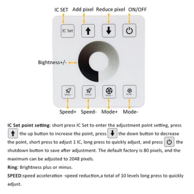 Izmantojot kontrolleri, var izvēlēties skrienošas 24V LED lentes apgaismojuma režīmus (kopā 20 režīmi), izvēlēties un kontrolēt apgaismojuma ātrumu un spilgtumu.