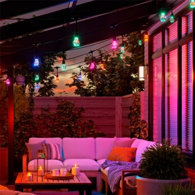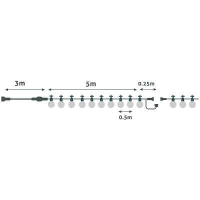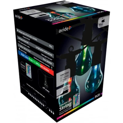 Komplekts LED āra dārza 5m virtenes dārzam un terasēm ar daudzkrāsainām spuldzēm un pulti AVIDE / 10-929 / Dekoratīva iekštelpu un ārtelpu virtene E27 spuldzēm / 5 metri / Integrēts cokols / Melns vads / Ar tālvadības pulti