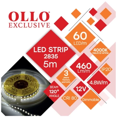 LED лента SMD2835, 4000K, IP20, 12V, 4.8W/m, 460Lm/m OLLO / 05-1730 / LED Лента / 4000K - нейтральный белый / IP20 / 4.8 Вт/м / 460 Lm/m / 60 LED/м / SMD2835