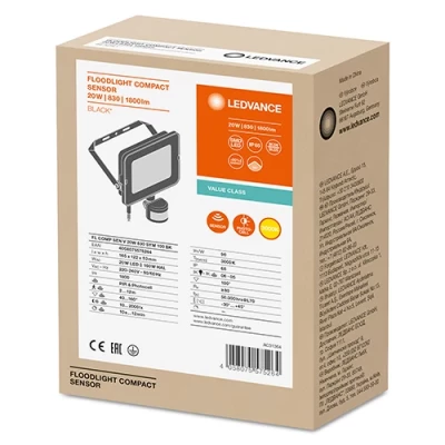 Уличный LED прожектор с сенсором FLOODLIGHT COMPACT SENSOR 20W LEDVANCE / 20-8011 / LED Прожектор / 3000К - теплый белый / 20 Вт / IP65 / Датчик освещенности / 1800 Lm